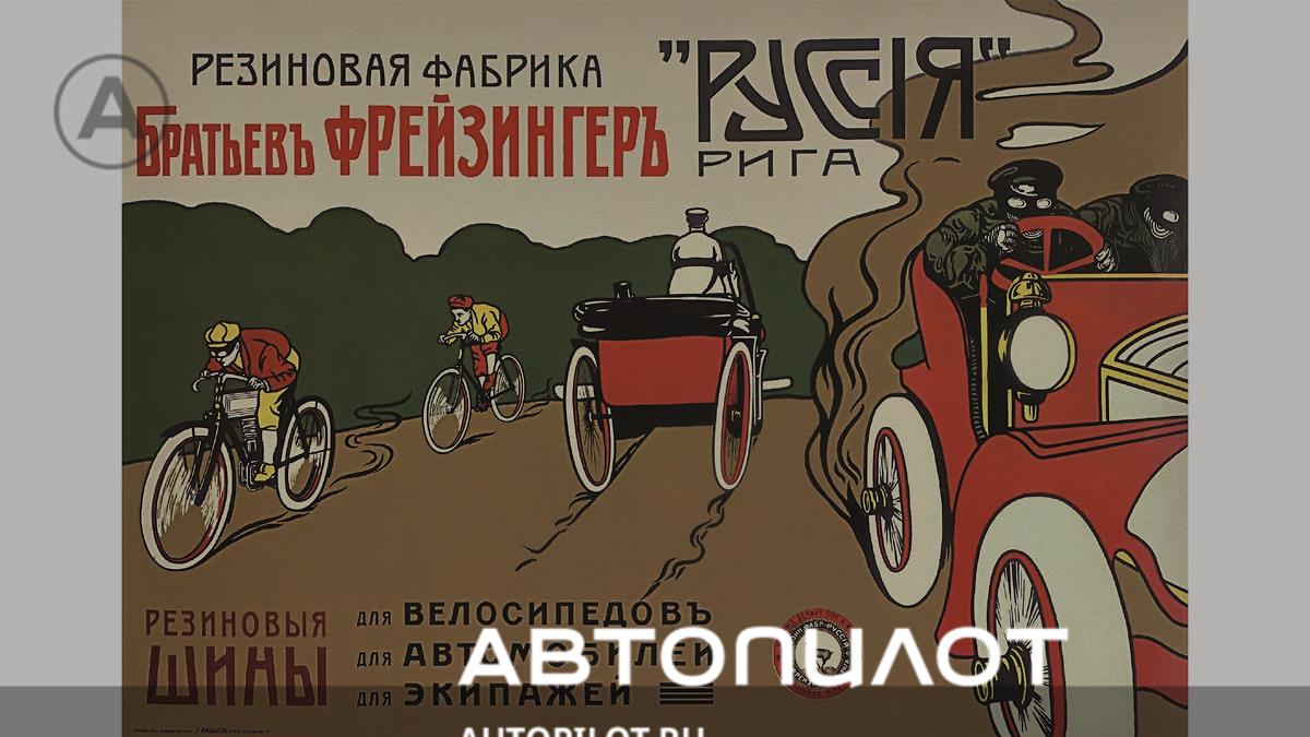 Реклама фабрики «Руссия» из Риги, выпускавшей резиновые шины для велосипедов, мотоциклов, экипажей и автомобилей — все эти транспортные средства видны на рисунке. Под таким названием фабрика существовала с момента основания в 1897 году и до 1910 года, когда стала акционерным обществом «Каучук»