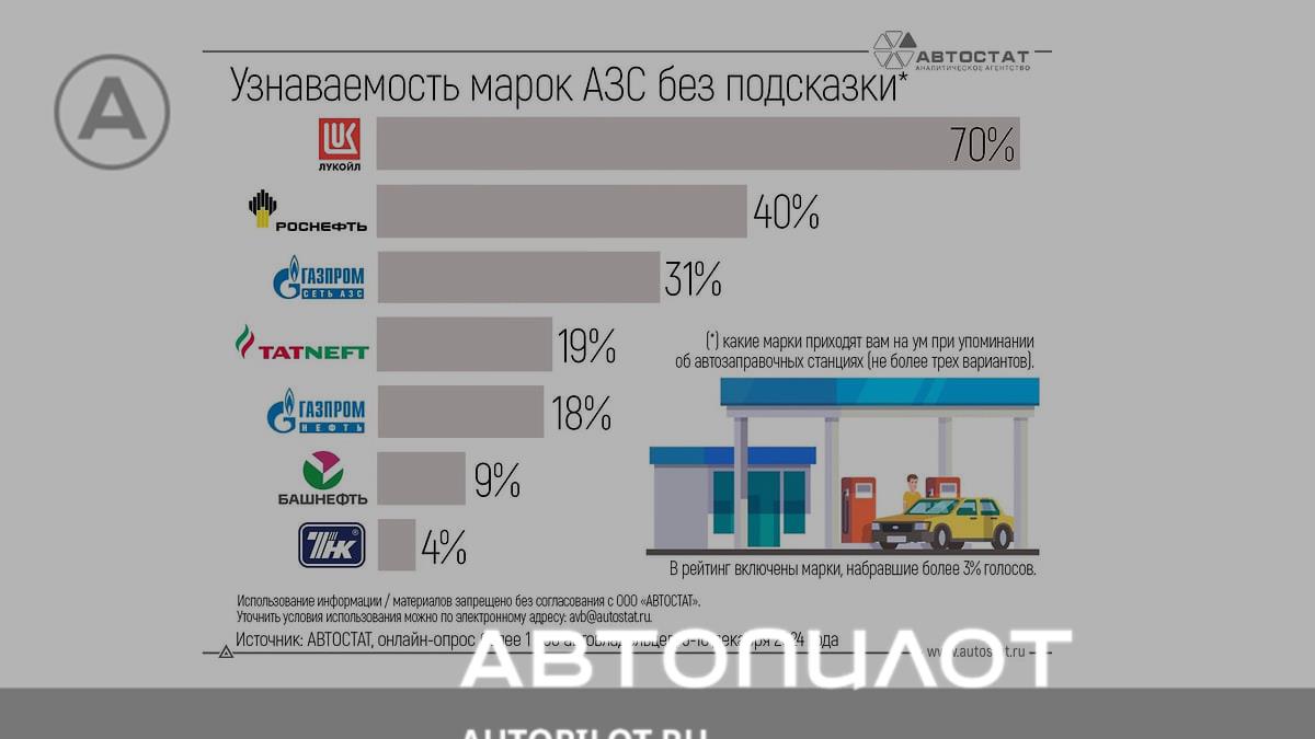 В ходе опроса выяснилось, что лишь 4,3% автовладельцев абсолютно не важен бренд АЗС для заправки своего автомобиля. Однако для подавляющего количества участников опроса имеет значение, на какую заправку заезжать. В ходе исследования респондентам предложили самостоятельно указать несколько марок АЗС, которые они предпочитают, не предоставляя список брнедов на выбор. В результате больше всех голосов набрал «Лукойл» (55,1%). В ТОП-5 также попали «Роснефть» (47,5%), «Газпромнефть» (41,5%), «Газпром» (24,1%) и «Татнефть» (20,9%).