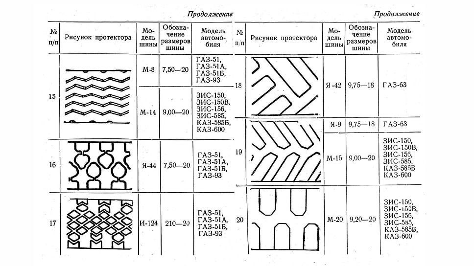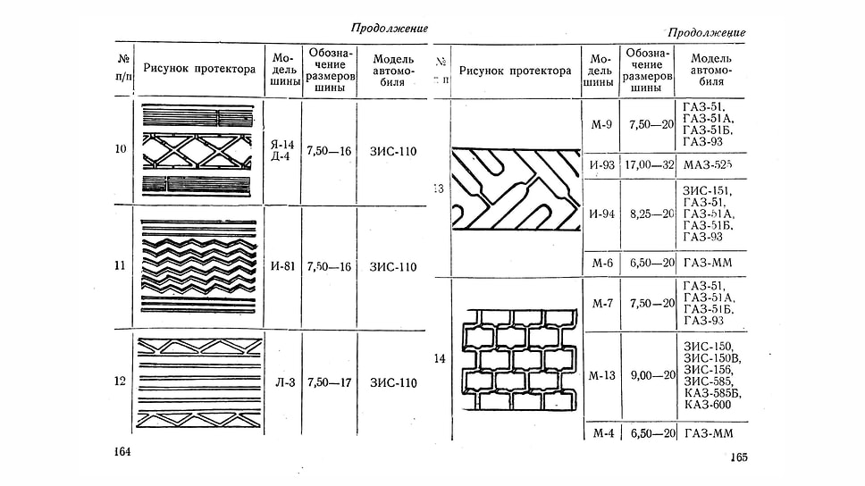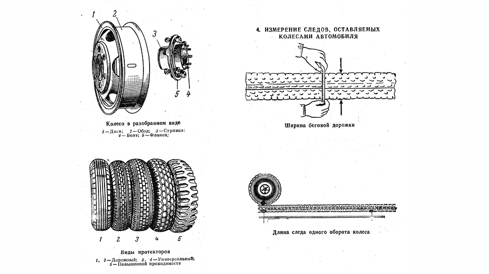 Все автомобили, собранные в таблицах, характеризуются параметрами, которые мы сегодня назвали бы второстепенными: колея передних и задних колес, модель шин — один-два варианта, окружность колес и ширина протектора. Эти данные в совокупности с изучением рисунка протектора шин — их приводится около трех десятков — позволяют установить тип резины и модель автомобиля.