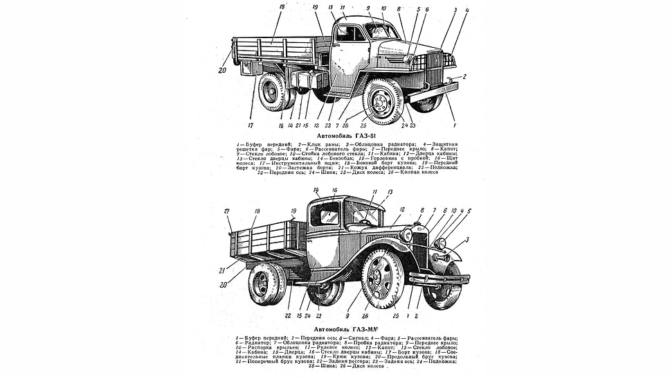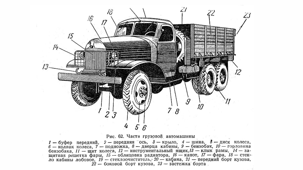 Автомобильная терминология мало поменялась почти за семьдесят лет. Хотя вряд ли мы назовем сегодня бампер машины буфером, а дверь — дверцей. Примечательно, что крупное дублирующее обозначение государственного регистрационного знака нанесено не только на задний борт грузовика, но и по бокам
