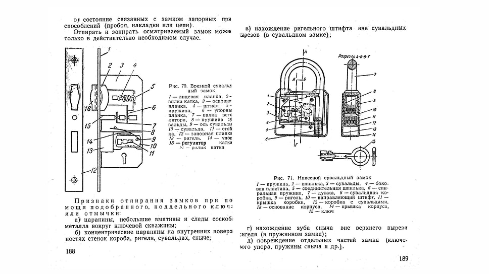 Обыск. «Мягкая мебель, матрацы, одеяла, подушки в случае необходимости прокалываются тонкой иглой, а в некоторых случаях отделяется обивка. Особо трудоемок обыск в книгах, так как каждую из них надо перелистать или, во всяком случае, держа переплет, встряхнуть, а также осмотреть корешок и обложку… Искать надо в подлинном смысле слова везде, включая посуду с готовой пищей, помойные ведра, полые статуэтки, лампы, рамки картин и т.д.».