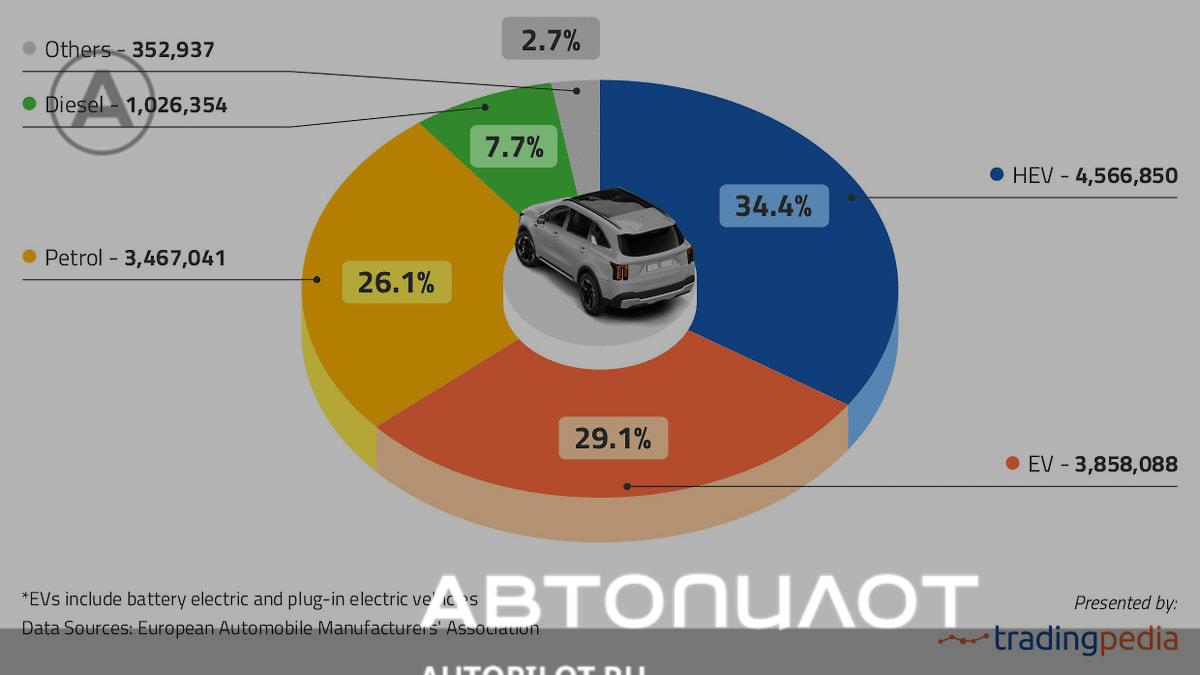 Аналитический проект TradingPedia провел исследование автомобильного рынка Европы за 2025 год и зафиксировал, что впервые в истории продажи электромобилей превысили продажи бензиновых автомобилей как по показателю за декабрь, так и по общему годовому объему продаж. Продажи электромобилей в Европе выросли более чем на 30% в годовом исчислении, увеличившись с 2,95 миллиона единиц в 2024 году до 3,86 миллиона (точная цифра — 3 858 088 единиц) в 2025 году. При этом самые большие продажи в Европе показали гибриды — 4 566 850, что превышает общий объем продаж бензиновых (3 467 041) и дизельных (1 026 354) машин.