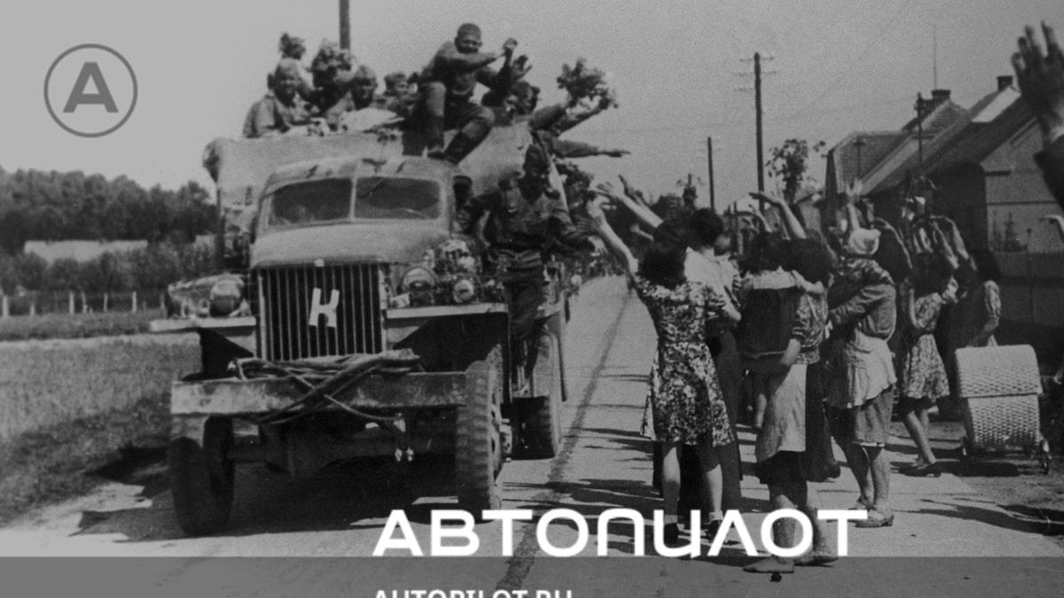 Женщины с цветами встречают бойцов Красной армии на автомобиле Studebaker US6. Чехословакия, май 1945 года