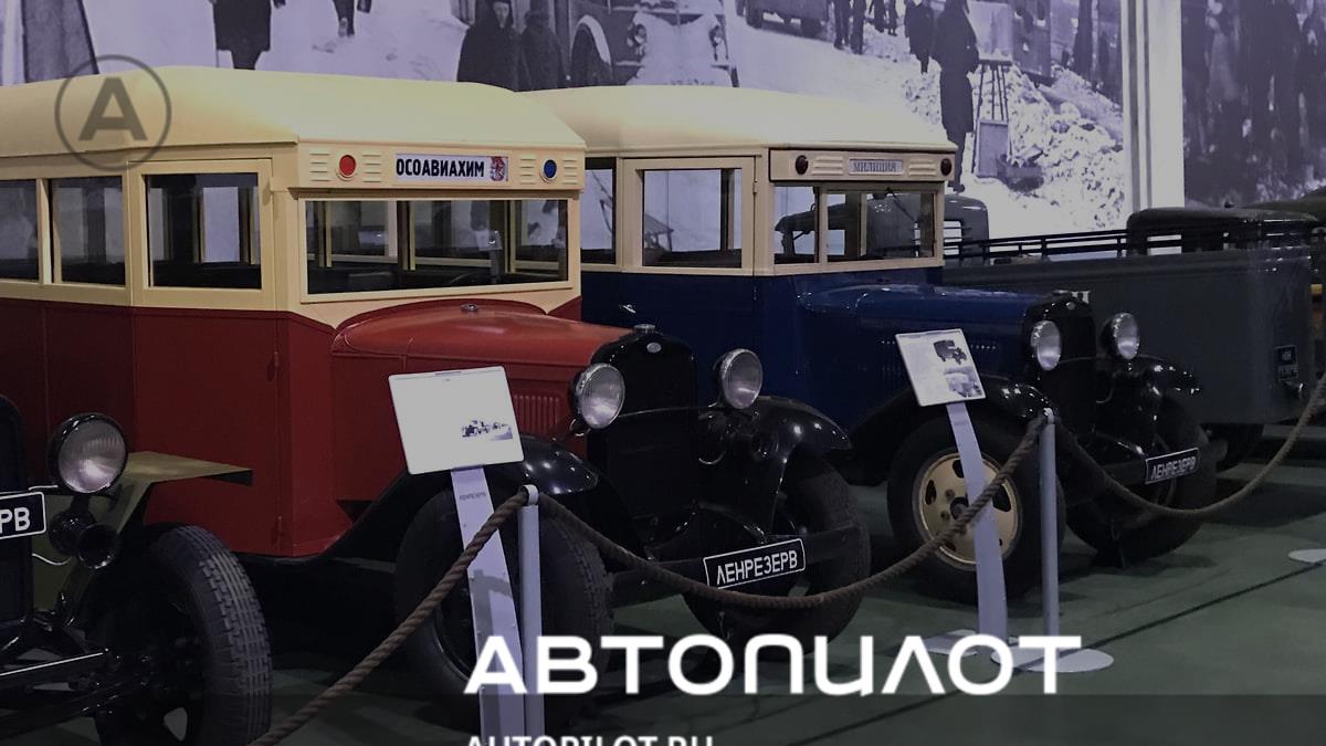 Экспозиция начинается с советских автомобилей 30-х и 40-х годов. На снимке — довоенные автобусы ГАЗ-03-30. Красный сделан как автобус «Осоавиахима» — Общества содействия обороне, авиационному и химическому строительству, а синий — милицейский